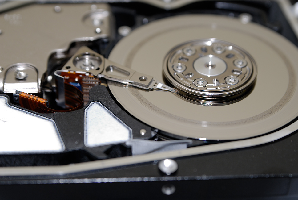 На рабочей поверхности магнитного диска видны повреждения от соприкосновения с упавшей магнитной головкой.