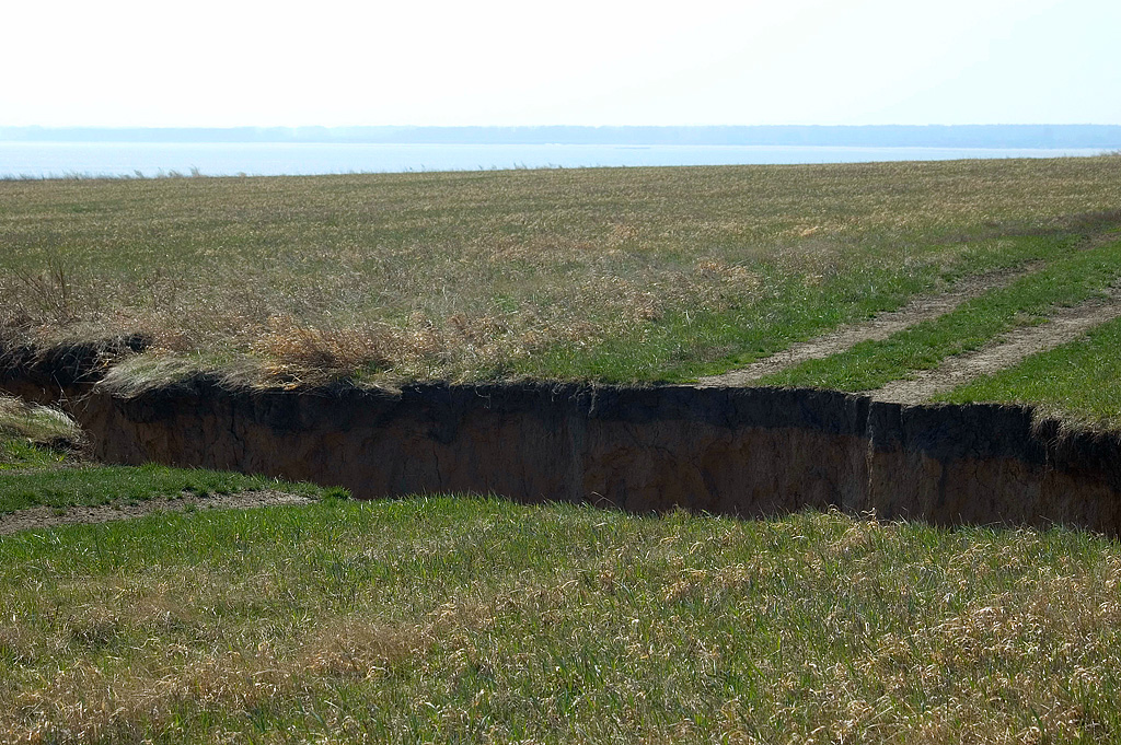 Свежий овраг пересекает полевую дорогу